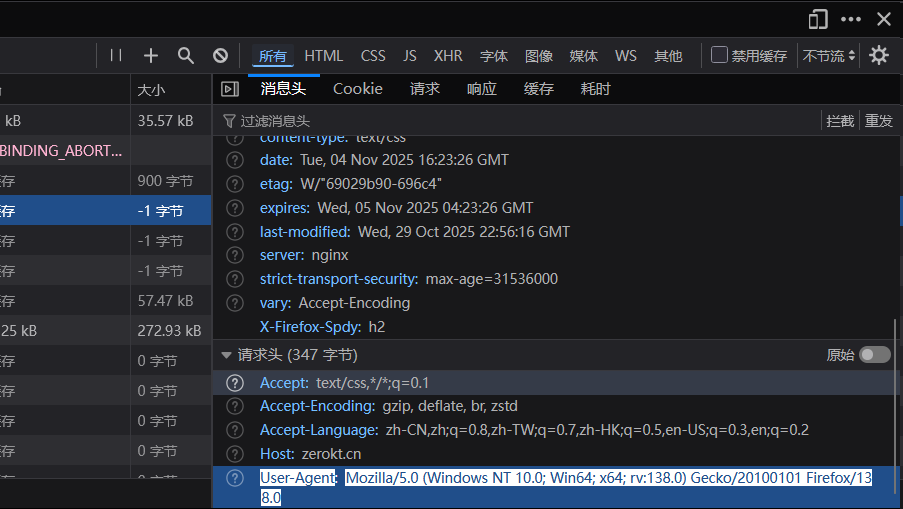 在浏览器中,可以这样找到自己的UA头:打开网页→右键→检查(或者审查元素和F12)→网络→刷新界面→随便打开一个界面并拉到最底部→复制UA头