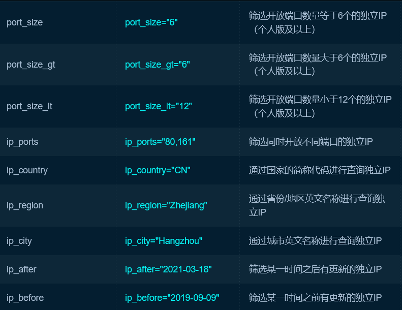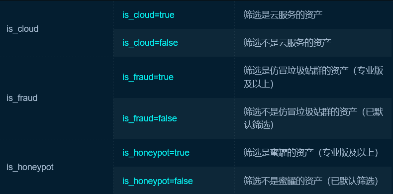 | 搜索属于指定自治系统编号(AS号)的资产 | asn = ‘AS4134’ #中国移动163 AS号:4134 #中国电信CN2 AS号: 4809 #中国网通AS号:9929 #中国联通AS号:9800 |