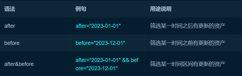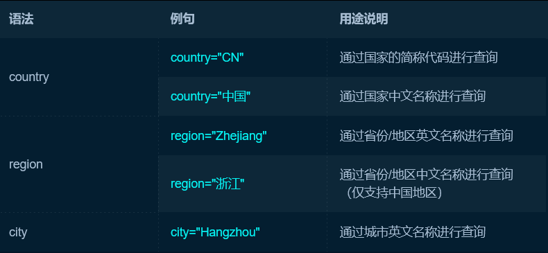 | 搜索位于指定国家的资产 | country = ‘CN’ |
