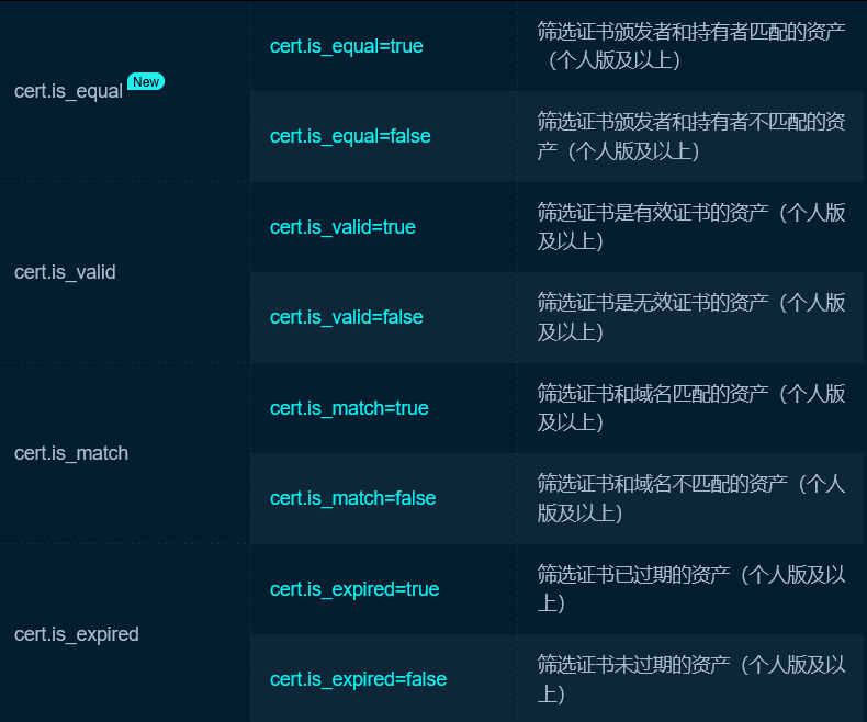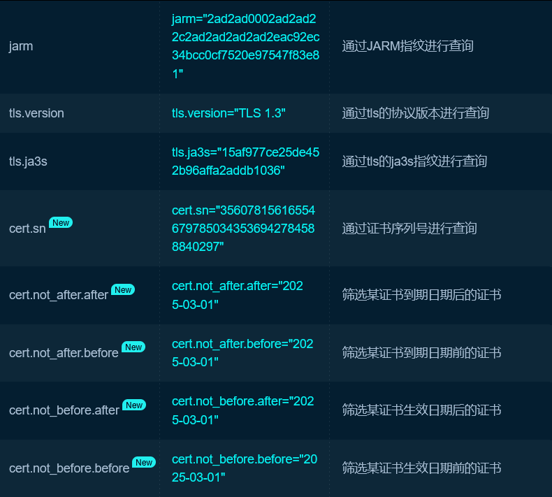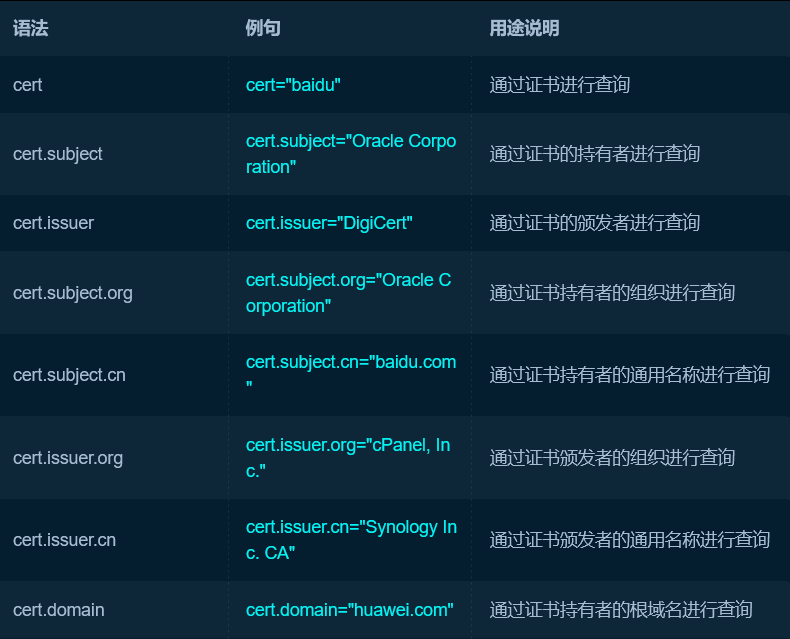 | 搜索SSL证书中的域名或其他信息 | cert = ‘baidu.com’ |