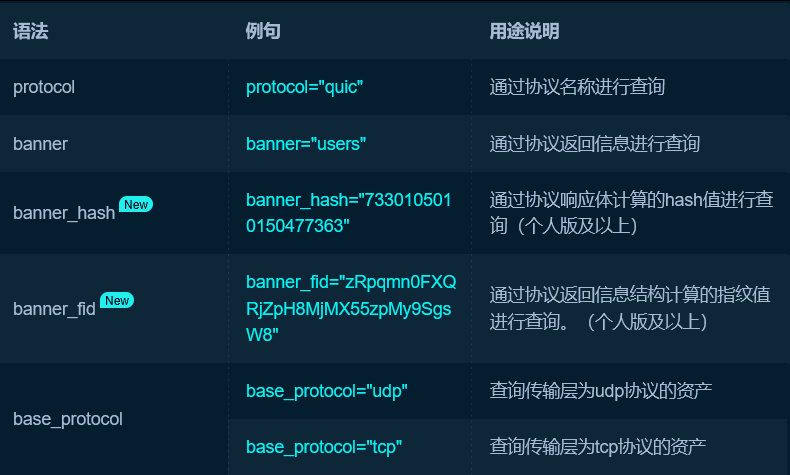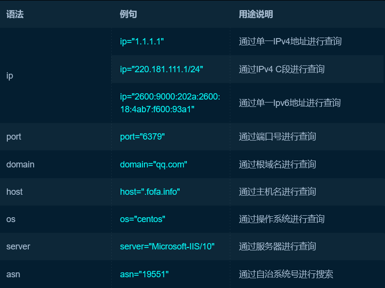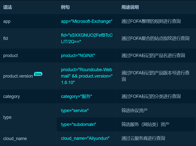 FOFA帮助文档:https://github.com/FofaInfo/Awesome-FOFA/tree/main