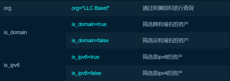 | 搜索与指定域名相关的资产 | domain = ‘baidu.com’ |